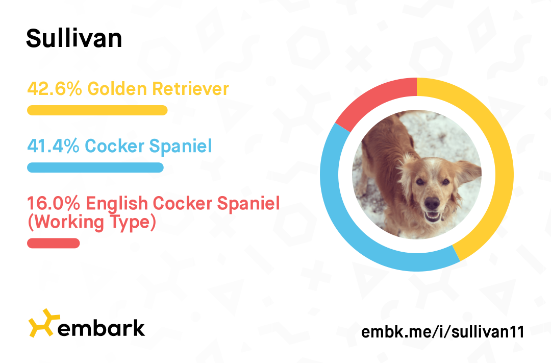 Eye (CAER) OFA Normal; Embark Gentics clear of genetic variants through Embark. Carrier for 2 genetic variants. He is a carrier of exercise induced collapse, but is not affected and we test our females to make sure he is not bred to another carrier. Sullivan does carry a 2 copies of the variant CDDY/IVDD, Type I IVDD. He is not affected. *Note: FGF4 retrogene on chromosome 12. In some breeds such as Beagles, Cocker Spaniels, and Dachshunds (among others) this variant is found in nearly all dogs. source Embark Genetics