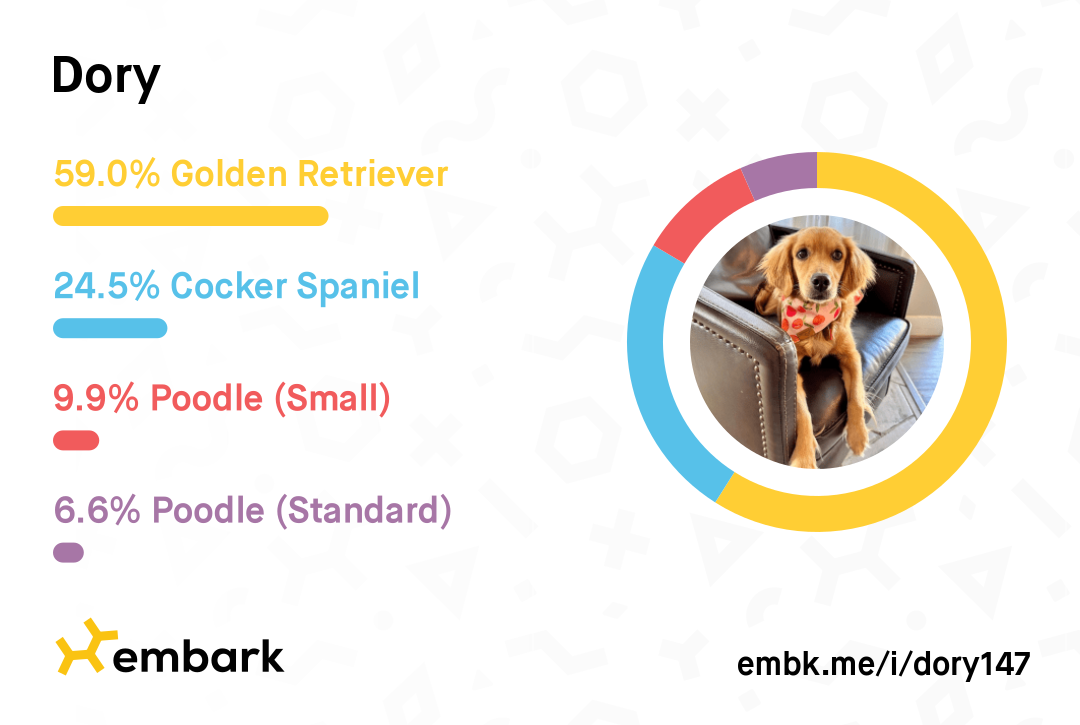 Dory is very gentle and sweet and has taken after her wonderful parents in many ways, and she is easy going and calm. She is extremely friendly and loves children, other dogs, and animals. She demonstrates an extremely high level of obedience and truly adores her guardian family The Cantrell’s. Dory proudly represents a high percentage of Golden Retriever at 59%, complemented by a charming 24.5% Cocker Spaniel, 9.9% Small Poodle, and 6.6% Standard Poodle heritage.