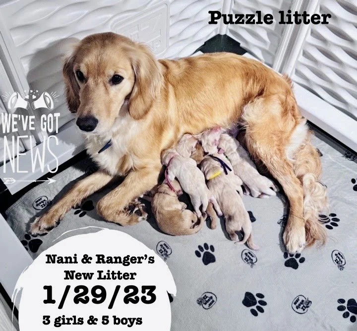 New litter of miniature golden retrievers. The mom is Nani (39 lbs) and the dad is Ranger (25 lbs).